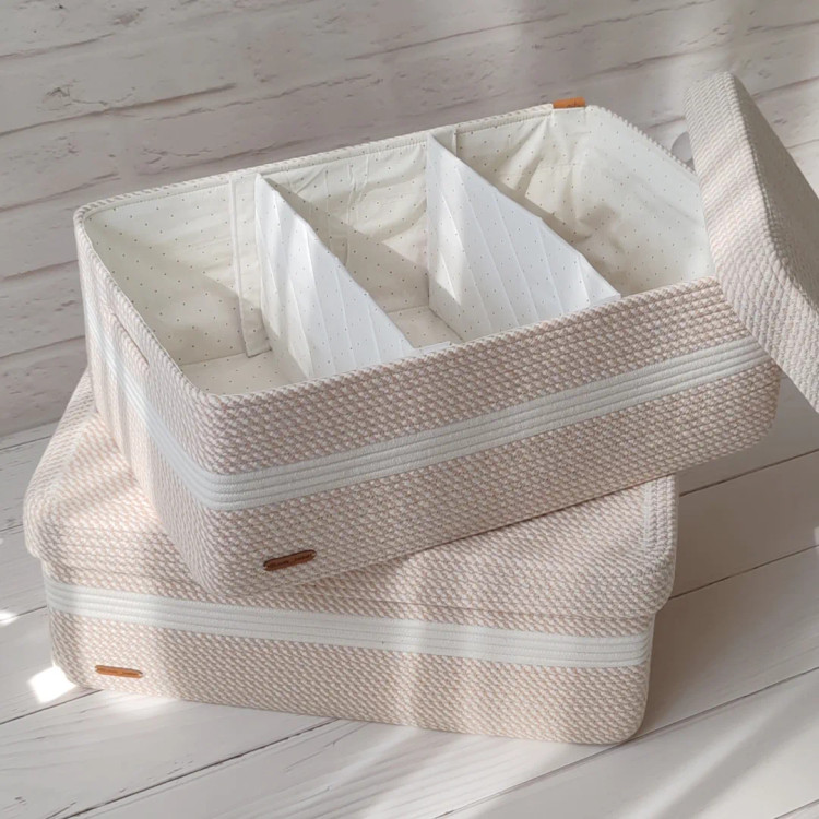 باکس های نظم دهنده و منقسم دار پارچه ای دوخته شده با پارچه کتان نخ ترک میتونی منقسم ها رو از محل اتصال جدا کرده و شستشو دهی قابل اجرا در طرح و ابعاد دلخواه شما.