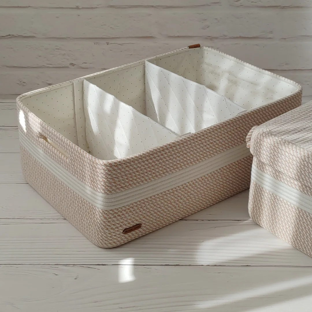 باکس های نظم دهنده و منقسم دار پارچه ای دوخته شده با پارچه کتان نخ ترک میتونی منقسم ها رو از محل اتصال جدا کرده و شستشو دهی قابل اجرا در طرح و ابعاد دلخواه شما.